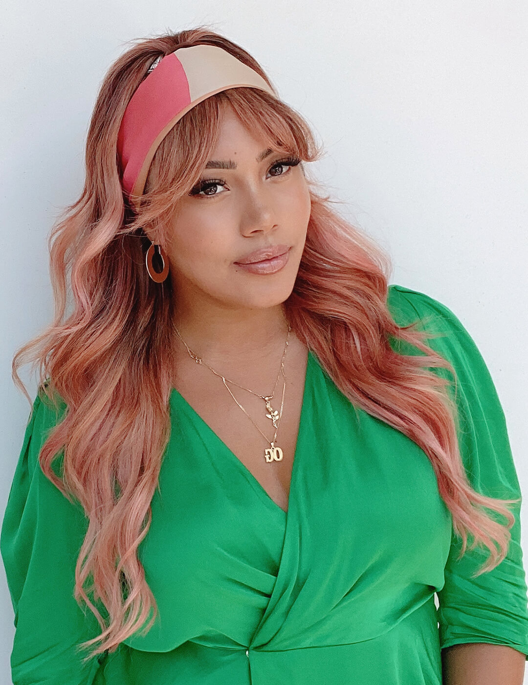 A hair styled in a huge cloud of tight ringlets, finished with clothes decked in sparkling frills, and bold green eye makeup.